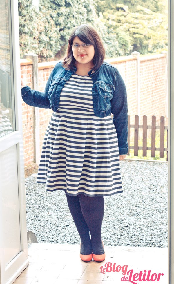 .Arrivée dans la semaine je ne suis pas déçue! Elle est en fait en jean , cintrée grâce a un nouer a attacher dans le dos, elle donne un effet bien évasé sur la bas, elle est légère (pour du jean) et très agréable à porter. Pour vous la montrer j'ai choisi un petit cardigan bleu et des escarpins rouges accordés à mon rouge a lèvres, je pensais la mettre juste avec une petite veste (sur photo 1) mais il faisait encore trop froid. Cette robe est un nouveau petit bijou pour ma garde robe ! Qui a dit que le rayé n'etait pas fait pour les rondes ?